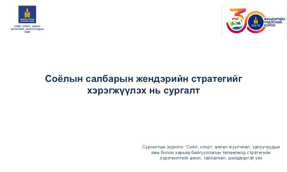СОЁЛЫН САЛБАРЫН ЖЕНДЭРИЙН СТРАТЕГИЙН ХЭРЭГЖИЛТИЙГ ЭРЧИМЖҮҮЛЭХ СУРГАЛТ БОЛЛОО