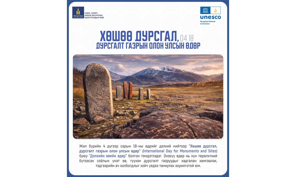 Хээр хөдөө орших хөшөө чулуу, булш бунхан, хадны зураг, бичиг, дурсгалт уран барилга зэрэг нь Монгол үндэстний оршихуйг гэрчлэх соёлын өв төдийгүй соёл иргэншлийн аюулгүй байдлыг сахин хамгаалагч юм. Бид энэхүү өдрийг тохиолдуулан нийт хүүхэд, залуучууддаа хандан дараах уриалгыг гаргаж байна: